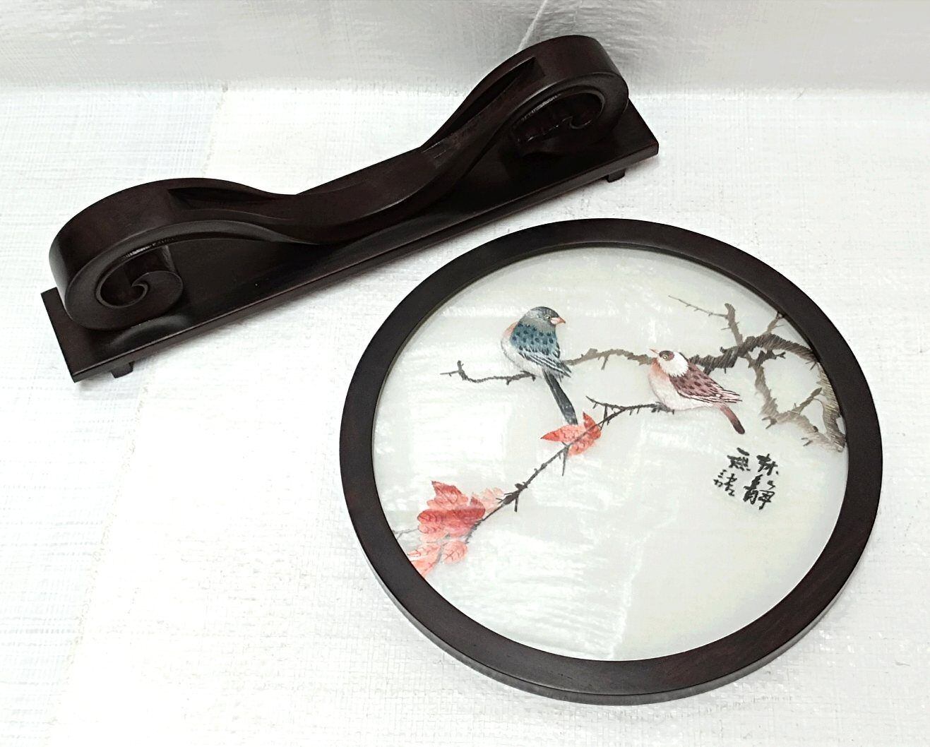 中国工芸 黒檀製枠・架台 両面シルクスクリーン鳥刺繍絵
